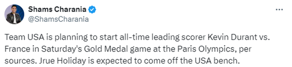 今年巴黎奥运会,男篮和女篮都是美国队和法国队争夺金牌;据名记shams报道,杜兰特将在金牌争夺战中首发出战,霍乐迪替补,这将是詹杜库首次首发出战奥运,美国最强首发来了,战法国的首发阵容为——詹姆斯、杜兰特、库里、布克和恩比德。