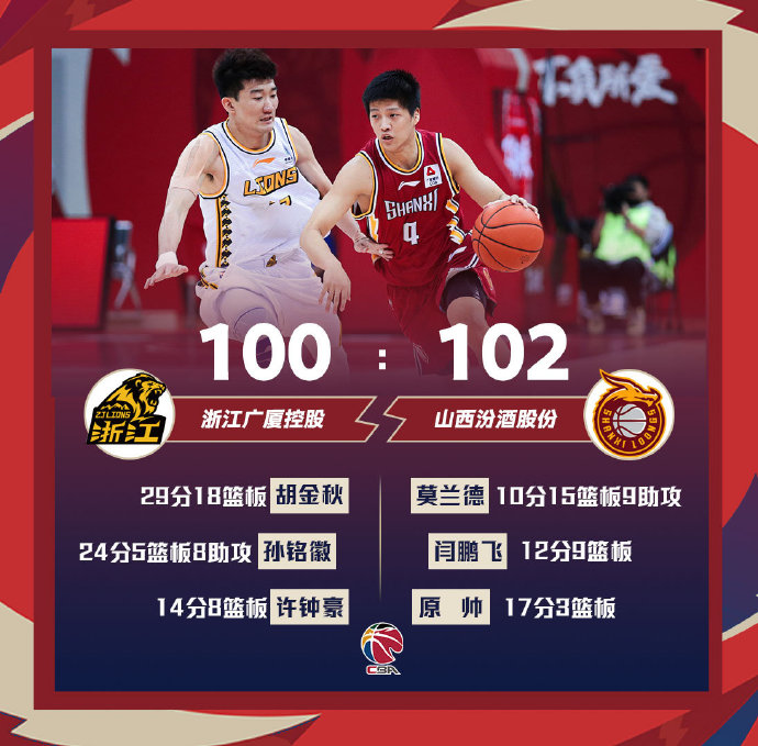 末节,胡金秋快攻上篮打成2+1,席益民手感火热再中一记三分。随后双方你来我往,比分交替上升。决胜时刻,孙铭徽急停跳投打成2+1,张宁后撤步中投也中,广厦三分不中,山西拿下比赛。全场比赛结束,广厦100-102山西。