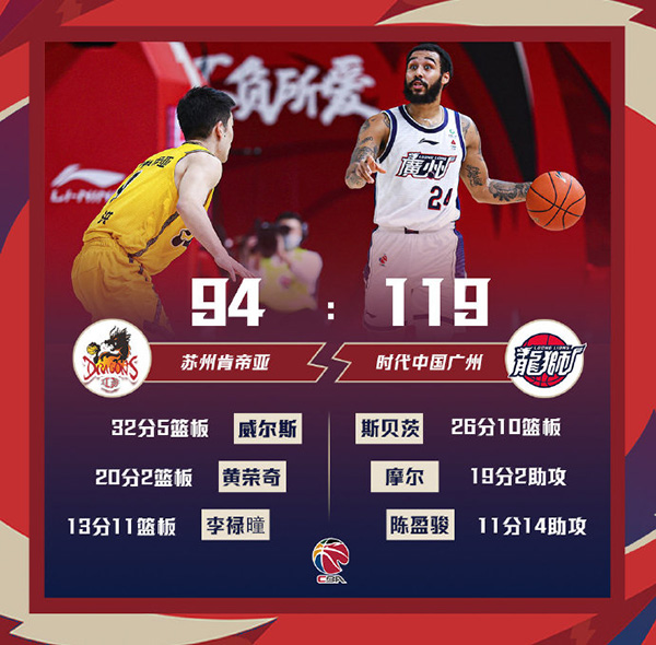 末节,斯贝茨篮下连拿4分扩大分差,黄荣奇投中三分后斯贝茨用同样方式还以颜色,广州男篮牢牢占据场上主动。随后比赛中两队展开对攻,江苏男篮换下威尔斯宣布胜负失去悬念,广州男篮则继续在进攻端占据优势,分差被不断拉开。随着赵晏满在终场前两分钟完成负角度高难投篮,广州男篮上场的12名球员全部有得分进账,他们也以117-87取得30分领先。最终比分定格在119-94,广州男篮本赛季完成对江苏男篮的四杀,同时送对手遭遇六连败。
