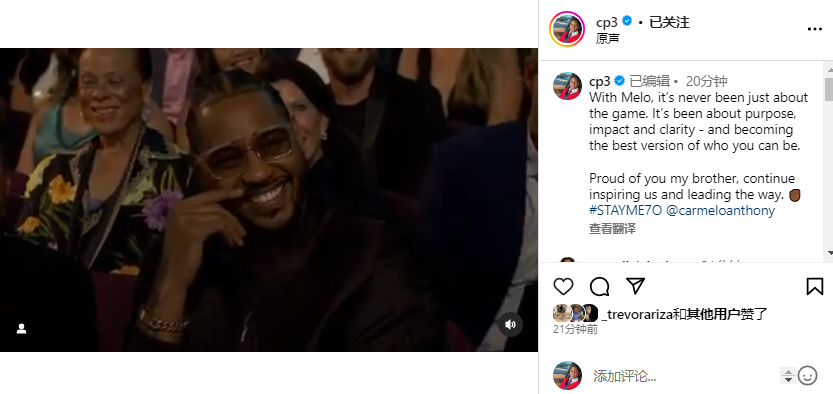 保罗晒视频并且写道:对于安东尼来说,这从来不至于比赛,这关乎价值和影响力,并成为你能成为的最好的自己。为你感到骄傲,我的兄弟,继续激励我们,引领前进。