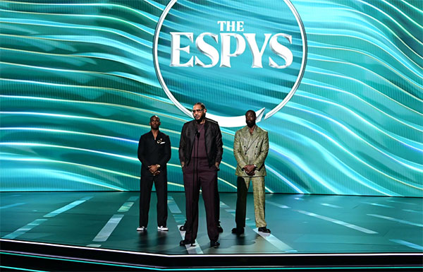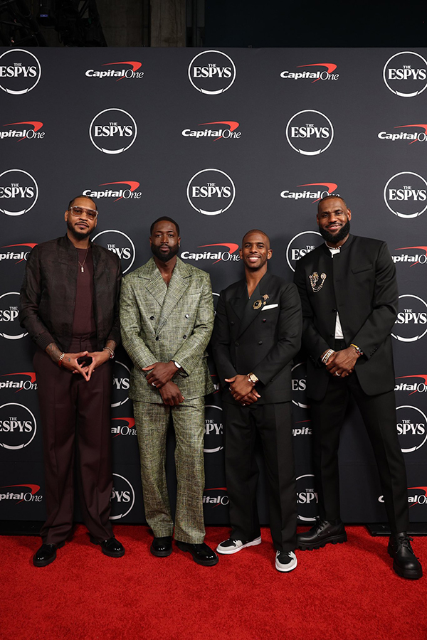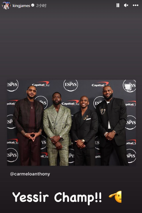 詹姆斯(38岁)、韦德(41岁)、安东尼(39岁)和保罗(38岁)都来到ESPY年度颁奖盛典现场,走红毯后他们一起合影;在颁奖典礼现场,詹姆斯领取最佳破纪录奖杯后,保罗和韦德上台,他们三人都发表演讲,詹姆斯表示安东尼是不可阻挡的,保罗表示安东尼的影响力不仅仅体现在篮球比赛上,韦德直言他们的关系超20年从未动摇,以兄弟身份向安东尼致敬。