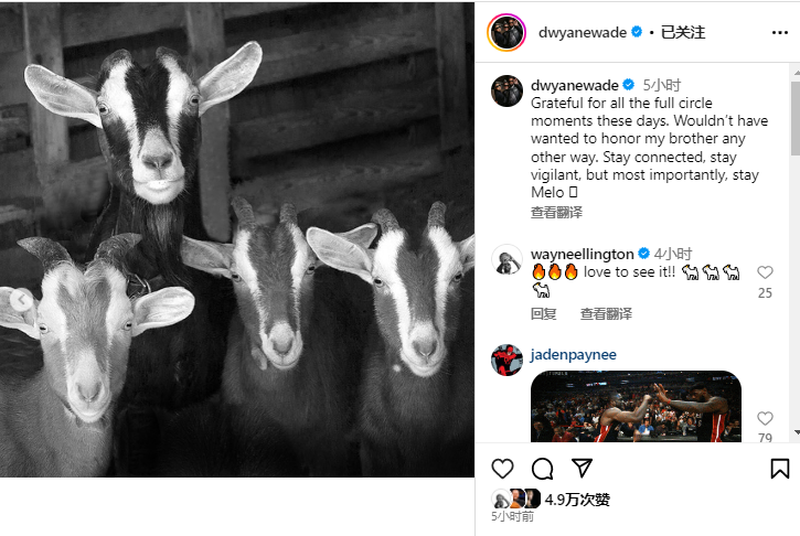 韦德还晒出四只山羊图片,言外之意就是他们四人历史GOAT。