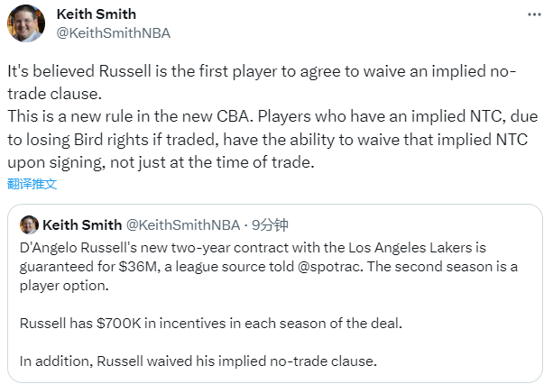 据NBA记者Keith Smith报道,拉塞尔与湖人新签订的两年合同的保障金额为3600万美元,每年有70万美元的奖金,第二年为球员选项,他还放弃了隐藏的交易否决权;新劳资协议允许球员主动放弃交易否决权,拉塞尔是历史上第一位放弃交易否决权的球员。