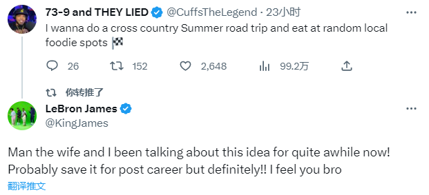 此前詹姆斯的友人@CuffsTheLegend发推写道:我想在夏天环游全国,吃遍各地美食;詹姆斯回复写道:我妻子和我讨论这个话题有一阵子了。也许会等我生涯结束后(再去),一定会去的!!我懂你哥们。