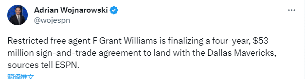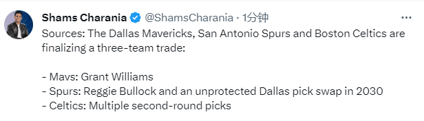 24直播网讯07月06日,据名记shams报道,独行侠、凯尔特人和马刺达成三方交易,格兰特-威廉姆斯4年5300万美元辅佐东契奇和欧文,布洛克前往马刺,绿军获选秀权。