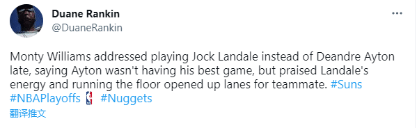 赛后,太阳主教练蒙蒂-威廉姆斯接受采访时谈到关键时刻弃用艾顿,表示:最后让兰代尔上场是因为德安德烈-艾顿的表现不是太好,必须要为兰代尔献上赞美,他活力无限;他一直在全速奔跑,这为队友创造出了突破的路径,兰代尔的表现给我们带来了能量。