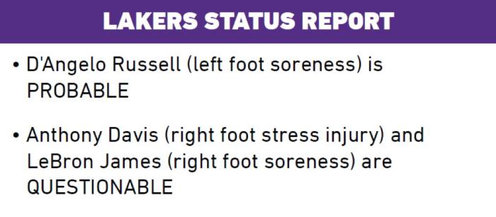 24直播网04月06日讯 ,湖人官方公布下一场对阵太阳的伤病报告,詹姆斯(右脚酸痛)和浓眉(右脚应力伤势)出战成疑(50%出场可能性),拉塞尔(左脚酸痛)大概率出战(75%出场可能)。常规赛最后2场比赛,预计詹眉会继续带伤出战冲击季后赛。