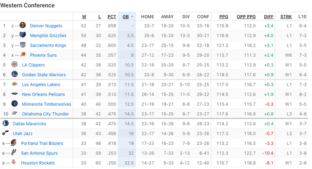 湖人输给快船之后,快船42胜38负排名西部第5,勇士同为42胜38负排名第6,湖人和鹈鹕则都是41胜39负,排名第7和第8。在仅剩2场比赛的情况下,这4队将会争夺第5和第6两个直接晋级季后赛的名额。