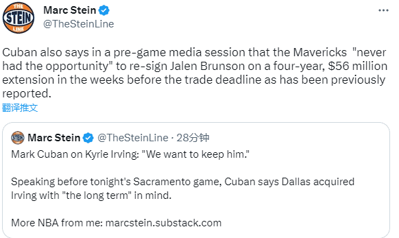对于球队关于欧文的未来计划,库班表示:我们想留下欧文,想与他续约,交易来他不是为了短期,而是球队长期计划的一部分。