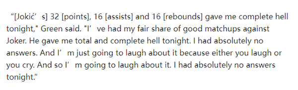 追梦还直言被约基奇打服了,公开表示:约基奇拿了32+16+16,有些夜晚我会给他一点点的小麻烦,但他今晚真的是彻底的摧毁了我,我完全没有办法。现在我也只能笑笑了,因为面对这种表现,你要么哭要么只能笑笑。我真的拿他毫无办法,他太出色了,他现在身材也有模有样的。我在场上好几次被他逼得一直跑来跑去,但他好像都没怎么累。向约基奇致敬,和他对抗总是非常有趣。