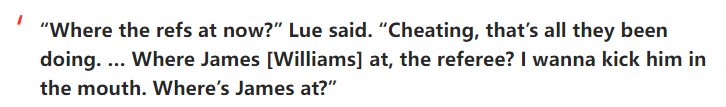 据报道,快船逆转击败勇士赛后,泰伦-卢从休息室跑到球员通道处,嘴里大喊:裁判现在在哪儿?作弊,这就是他们所做的一切,裁判詹姆斯-威廉姆斯在哪儿?我真想踢烂他的嘴,裁判詹姆斯在哪儿?
