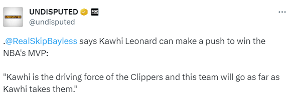 赛季至今,小卡已经出战44场比赛,场均拿到24.2分6.4篮板3.7助攻1.7抢断和0.9盖帽,快船35胜15负排在西部第三位,对于小卡的出色表现,名嘴Skip表示小卡可以争夺MVP:莱昂纳德是快船队的动力,在他的带领下,快船可以走得更远;名嘴Keyshawn Johnson则表示小卡赢得MVP的几率很高:他在场上打出攻防一体的表现,球队正在获胜,而且他打了整个赛季的大部分时间。