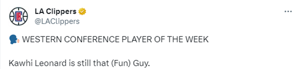 快船官方祝贺小卡获得周最佳,晒海报并且配文写道:科怀仍旧是那个有趣的家伙。