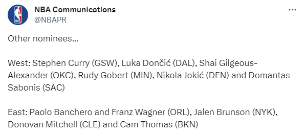西部:库里、东契奇、亚历山大、戈贝尔、约基奇和小萨博尼斯