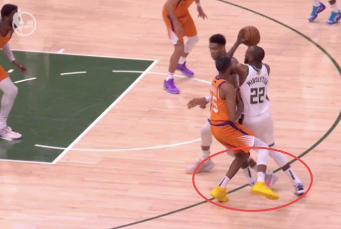 可是让米格尔顿没有想到的是,字母哥的脚伸得太出去,而且没有及时收回,米格尔顿自己踩到了字母哥的脚,脚踝也出现了让人冒冷汗的变形,所幸的是米格尔顿顺势起跳,避免了伤病的发生,不过这惊慌的一幕也让两人都吓了一跳,毕竟如果字母哥把米格尔顿给垫伤了,那就真的不用玩了。