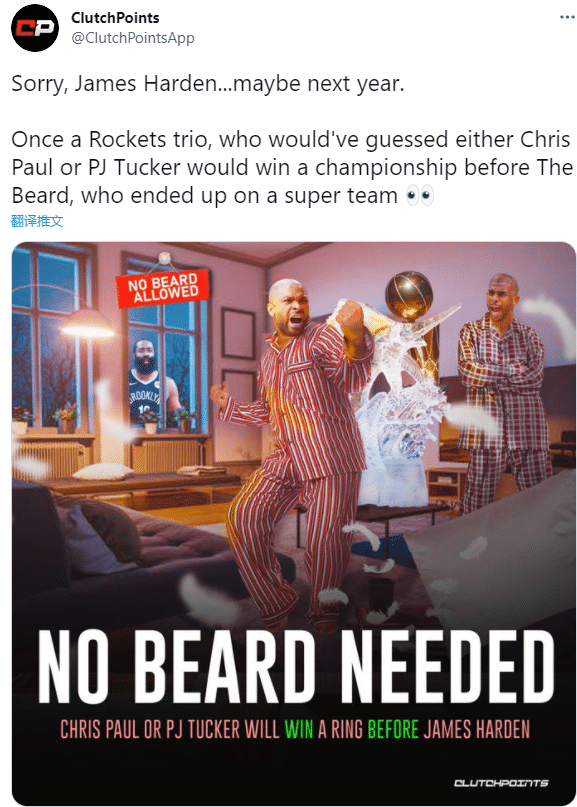 7月5日,美国媒体制作了一张漫画,漫画中保罗和塔克在房间里面争冠,而哈登正站在窗外观看,美媒CLUTCH还扎心的配文:对不起,哈登,你只能等到明年了,曾经的火箭三巨头,谁能想到保罗和塔克先进入决赛,而且哈登加入的是一支超级球队。