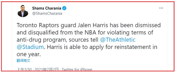 据名记Shams Charania报道,猛龙队后卫杰伦-哈里斯因违反禁药规定,被NBA联盟解雇并取消参赛资格,一年后他可以向联盟申请复职。