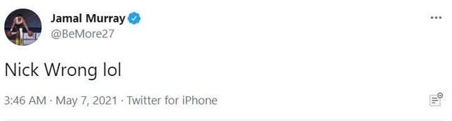 24直播网讯 北京时间5月7日,福克斯体育评论员尼克-怀特谈到了掘金球星约基奇。他认为约基奇今年大概率会拿下MVP,但是他可能是近35年最菜的MVP。结果,掘金球员贾马尔穆雷立刻在社交媒体上发表自己的观点,他直接评论:尼克-错误。(Nick wrong)