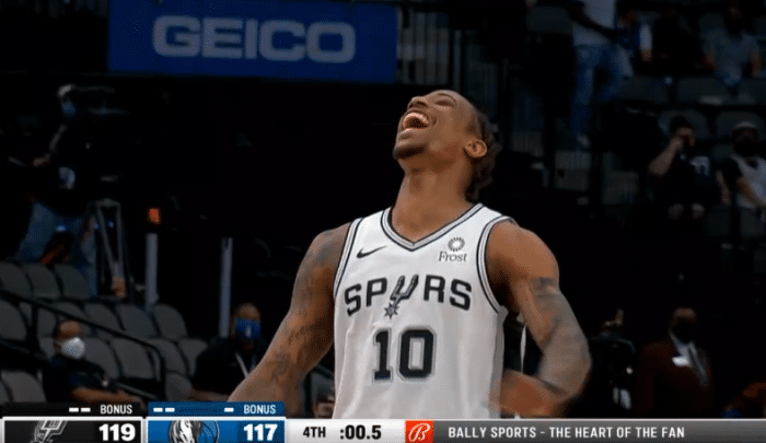 终场前马刺最后一攻,德罗赞用撤步后仰中投绝杀独行侠,0.5秒绝杀太疯狂,中投之王回来了;德罗赞制胜一击,随后他仰天大笑着怒吼庆祝,疯狂宣泄内心的情绪;紧接着德罗赞和怀特、约翰逊等队友拥抱,提前庆祝胜利。