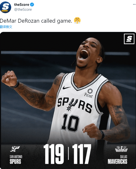 24直播网讯马刺119-117险胜独行侠,德罗赞全场上场34分钟25投13中轰下33分8助攻5篮板,终场前0.5秒极限中投绝杀,德罗赞绝杀独行侠冲上热搜引热议,马刺官方连续更新动态,发推写乱码疯狂庆祝,马刺名宿吉诺比利也口出乱码,为德罗赞绝杀而疯狂庆祝。
