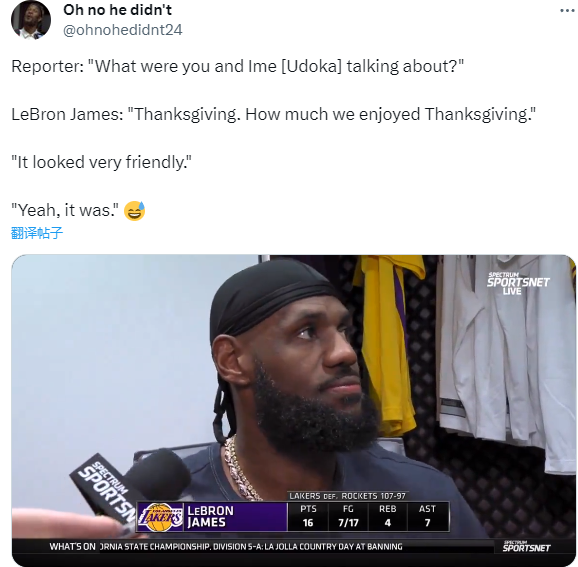 赛后谈到与乌度卡争吵,记者问:你和乌度卡聊什么呢?詹姆斯:感恩节,我们多么享受感恩节;记者:看起来费城友好;詹姆斯:是的,确实如此。