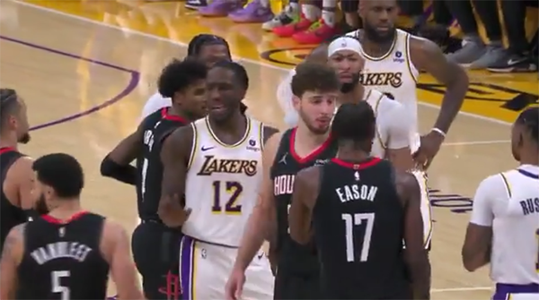 湖人和火箭比赛末节8分35秒,场上发生小冲突,雷迪什撞到伊森的胸部,伊森想找雷迪什讨说法,普林斯推开了伊森,申京劝阻伊森却被推开,浓眉和范弗利特都围过来,最终雷迪什吃到技术犯规,申京继续安抚并让伊森冷静下来。