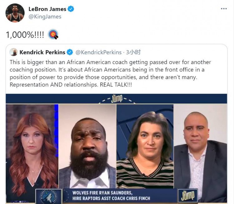 随后CJ-麦科勒姆,以赛亚-托马斯,奎因-库克,诺兰-史密斯也纷纷发声,帕金斯转发相关新闻然后表示“又一个合格的非裔助理教练没有得到机会!这不仅仅是一个非裔美国教练在另一个教练职位上被拒之门外,而是关乎非裔美国人能否获得在管理层拥有权利的机会,而这种机会并不多,真心话!”詹姆斯也转发评论:1000%!