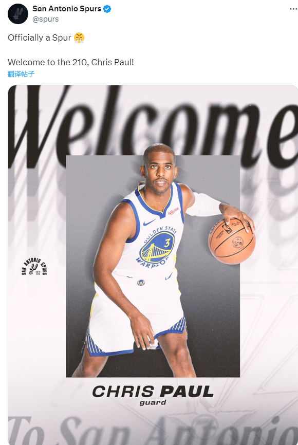 此前马刺已经官宣签约保罗,据悉他们双方签下1年1100万美元合同,当时马刺晒出保罗身穿勇士3号球衣照引热议。