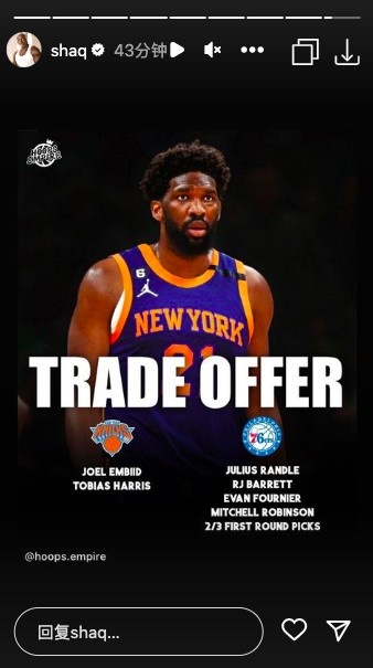 恩比德会去哪里呢?根据爆料,恩比德很期待大城市,比如说纽约,在这一次的爆料中,奥尼尔也是列出了交易的筹码,奥尼尔表示,尼克斯将交出尼克斯出兰德尔、巴雷特、富尼耶、米切尔-罗宾逊以及两到三个首轮,而费城这边交出恩比德、托拜亚斯-哈里斯。7换2的交易,这个交易看起来费城并不是 特别实惠,但是如果恩比德申请交易,还想去大城市,这个交易可能也是最终的方案,否则奥尼尔也不会曝出猛料。