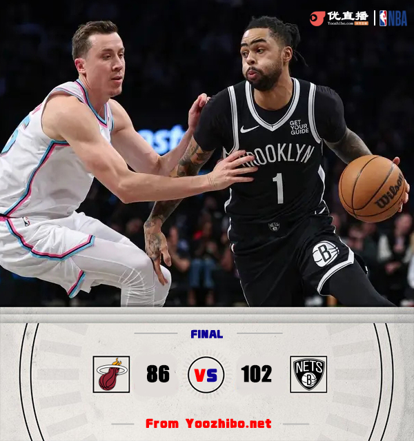 NBA常规赛,热火对阵篮网,热火上场比赛力克76人,篮网则是不敌奇才。开场后阿德巴约带领热火率先打出攻势,随后篮网外线多点开花掀起反扑将比分反超,罗齐尔替补登场后状态火热接连拿分,热火在第一节后半段到第二节开局打出一波高潮夺回领先。篮网多点开花紧追不舍,并且在半场结束前连得7分将比分追平。易边再战,克拉克斯顿在内线表现活跃,阿德巴约强势回应联手希罗帮助热火再度建立领先。最后一节热火进攻断电,篮网一举反超比分并将分差拉大到两位数,最终篮网102-86扑灭热火。