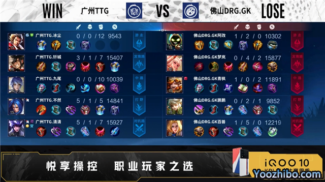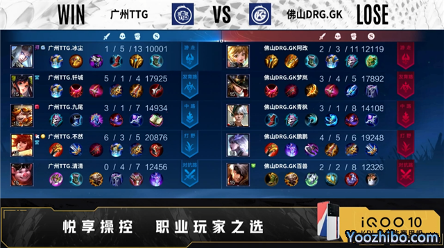开局双方正常抢线。2分34秒广州TTG拿下暴君。2分53秒发育路广州TTG击杀马可波罗,拿下一血。3分34秒河道佛山DRG.GK击杀裴擒虎,打出0换2,拿下主宰。4分49秒野区佛山DRG.GK击杀东皇太一,打出0换2。5分24秒野区广州TTG击杀镜,对抗路击杀马可波罗,摧毁敌方发育路外塔、对抗路外塔。6分50秒广州TTG拿下暴君。7分27秒对抗路广州TTG击杀马可波罗,摧毁敌方对抗路二塔。8分42秒野区广州TTG击杀镜,打出1换1,广州TTG拿下主宰。9分41秒佛山DRG.GK摧毁敌方发育路外塔、对抗路外塔。10分27秒对抗路广州TTG击杀夏侯惇,打出0换2,拿下暗影主宰,摧毁敌方中路外塔、中路二塔。11分12秒中路佛山DRG.GK击杀东皇太一,广州TTG拿下暗影暴君。13分14秒广州TTG摧毁敌方发育路二塔,14分35秒广州TTG拿下暗影主宰。15分33秒发育路佛山DRG.GK击杀东皇太一,双方打出1换1,广州TTG拿下暗影暴君。16分37秒野区广州TTG击杀夏侯惇,沈梦溪二连击破,打出2换4,摧毁敌方中路高地、发育路高地。18分24秒广州TTG拿下暗影主宰。20分15秒野区佛山DRG.GK击杀东皇太一,打出0换2。21分05秒佛山DRG.GK摧毁敌方中路外塔,拿下风暴龙王。22分41秒佛山DRG.GK摧毁敌方中路二塔、发育路二塔。23分23秒发育路佛山DRG.GK击杀东皇太一,摧毁敌方对抗路二塔。24分45秒中路佛山DRG.GK击杀猪八戒,广州TTG孙尚香二连击破,打出2换2,广州TTG拿下风暴龙王。26分48秒广州TTG摧毁水晶拿下比赛。