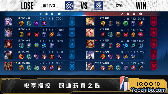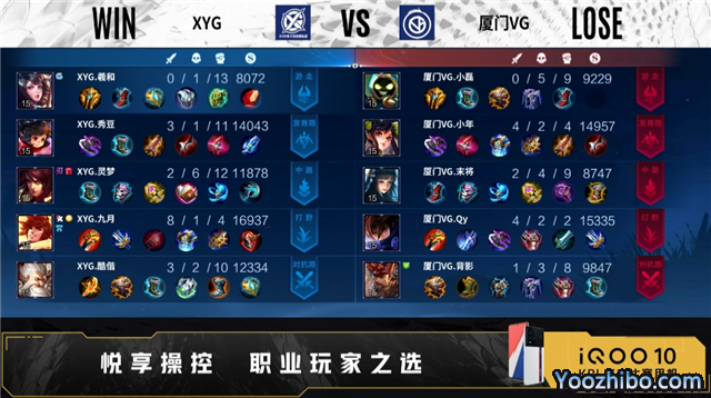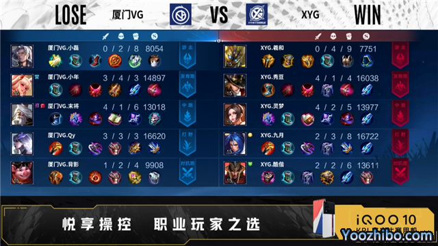 开局XYG四人入侵对方野区。1分01秒XYG击杀太乙真人,拿下一血。1分56秒对抗路XYG击杀廉颇,河道XYG击杀太乙真人,拿下暴君。3分04秒对抗路XYG击杀廉颇,摧毁敌方对抗路外塔,拿下主宰。4分41秒发育路厦门VG击杀周瑜,打出0换1。5分41秒对抗路XYG击杀太乙真人,打出0换1。6分51秒XYG摧毁敌方发育路外塔、中路外塔,发育路厦门VG击杀裴擒虎,打出0换2。7分13秒发育路厦门VG击杀裴擒虎,打出0换2,XYG摧毁敌方对抗路外塔。8分24秒野区厦门VG击杀周瑜,打出0换2,摧毁敌方发育路外塔,XYG拿下主宰。10分01秒发育路厦门VG击杀老夫子,打出0换1,拿下暗影主宰,XYG拿下暗影暴君。11分25秒厦门VG摧毁敌方对抗路外塔,击杀周瑜。12分40秒中路厦门VG击杀周瑜,打出0换1。14分37秒中路厦门VG拿下暗影主宰,XYG击杀西施,打出0换3,摧毁敌方发育路二塔、高地,击杀太乙真人、廉颇,拿下暗影暴君。16分05秒XYG摧毁敌方中路高地,16分45秒摧毁敌方对抗路二塔。17分27秒对抗路XYG裴擒虎二连击破,打出2换2。18分26秒XYG拿下暗影主宰。19分25秒XYG击杀西施,摧毁敌方对抗路高地,打出1换3,摧毁水晶拿下比赛。