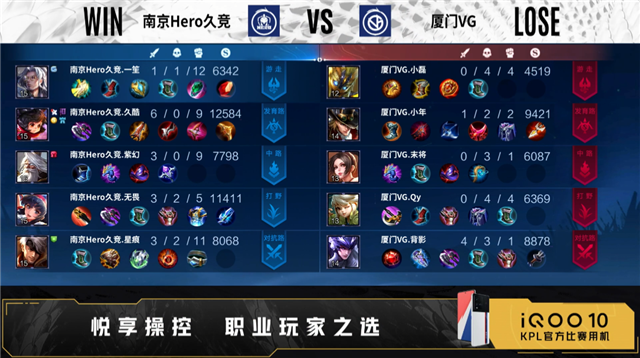 开局双方正常抢线。2分36秒发育路厦门VG击杀公孙离,拿下一血。3分04秒厦门VG拿下暴君,击杀大乔,南京Hero久竞打出1换3。4分09秒南京Hero久竞拿下主宰。5分06秒河道厦门VG击杀廉颇,双方边路互换。6分43秒厦门VG摧毁敌方发育路外塔,南京Hero久竞摧毁敌方对抗路外塔。7分31秒南京Hero久竞拿下暴君,厦门VG摧毁敌方对抗路外塔,南京Hero久竞摧毁敌方发育路外塔。8分13秒野区南京Hero久竞击杀宫本武藏,打出1换1,拿下暴君。9分14秒中路南京Hero久竞击杀盾山,打出0换1。10分15秒南京Hero久竞拿下暗影主宰,厦门VG击杀廉颇,拿下暗影暴君。11分56秒南京Hero久竞摧毁敌方发育路二塔、中路外塔,发育路击杀狄仁杰,打出1换2,摧毁敌方发育路高地。14分03秒南京Hero久竞摧毁敌方对抗路二塔,拿下暗影主宰。14分36秒对抗路厦门VG击杀周瑜,打出0换1,拿下暗影暴君。15分20秒中路厦门VG击杀廉颇。17分30秒中路厦门VG击杀公孙离,拿下暗影主宰,高地南京Hero久竞梦奇击杀沈梦溪,中路厦门VG击杀廉颇,摧毁敌方中路外塔、二塔。19分24秒厦门VG拿下暗影暴君,对抗路击杀梦奇。20分27秒河道厦门VG击杀周瑜,摧毁敌方对抗路二塔,拿下风暴龙王,南京Hero久竞摧毁敌方对抗路高地。22分15秒厦门VG摧毁敌方对抗路高地、中路高地,击杀周瑜,双方打出1换1。24分06秒野区南京Hero久竞击杀宫本武藏,拿下风暴龙王。24分56秒南京Hero久竞摧毁敌方中路高地。25分37秒南京Hero久竞击杀宫本武藏,打出0换4,摧毁水晶拿下比赛。