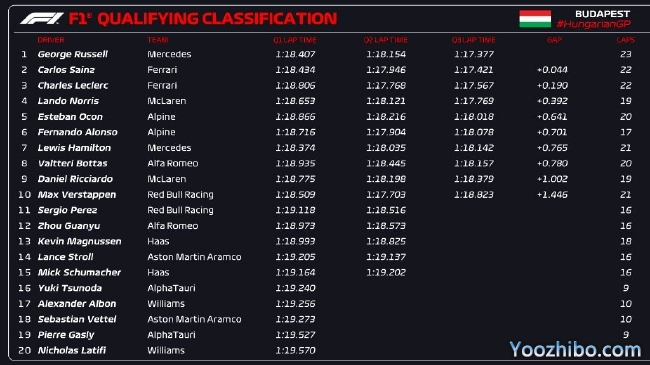 24直播网讯 2022年F1匈牙利大奖赛排位赛在亨格罗宁赛道结束,梅赛德斯车队拉塞尔Q3最后一个飞驰圈刷新成绩,超越法拉利车手塞恩斯,拿到F1生涯首个杆位!这也是梅赛德斯车队本赛季首个杆位!塞恩斯第二,他的队友勒克莱尔第三。