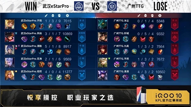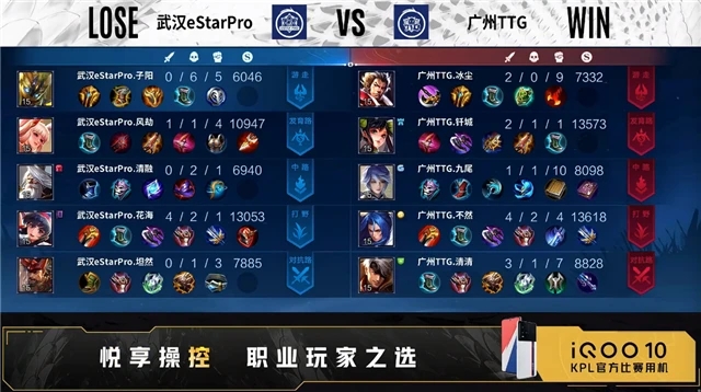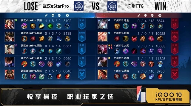 开局广州TTG入侵野区反掉红BUFF。2分10秒广州TTG野区击杀鬼谷子拿到一血。3分59秒广州TTG对抗路击杀鬼谷子。4分43秒广州TTG野区击杀鬼谷子。5分53秒广州TTG野区击杀鬼谷子。7分15秒发育路团战武汉eStar打出1换2。9分06秒武汉eStar野区击杀橘右京。10分26秒广州TTG拿下暗影暴君。10分48秒武汉eStar拿下暗影主宰。13分58秒广州TTG中路击杀娜可露露。14分51秒广州TTG拿下暗影主宰。16分12秒广州TTG摧毁敌方发育路高地塔并打出0换3。16分32秒广州TTG团灭对手摧毁水晶拿下比赛。