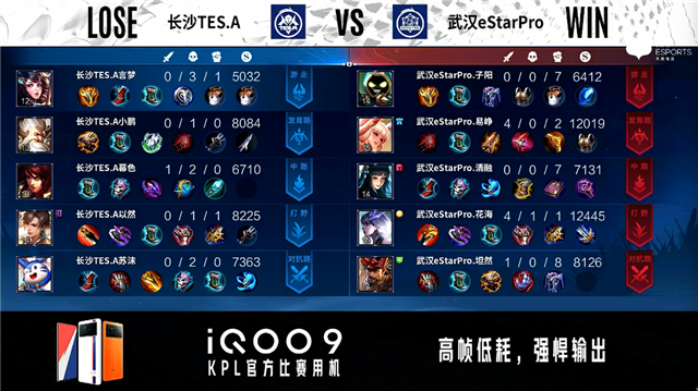 双方常规开局。2分38秒长沙TES.A中路下河道击杀鲁班大师拿到一血。3分41秒长沙TES.A拿下主宰。4分48秒长沙TES.A发育路击杀虞姬。5分13秒武汉eStar中路击杀兰陵王。5分39秒长沙TES.A对抗路击杀澜。6分38秒武汉eStar中路击杀娜可露露。7分11秒中路团战武汉eStar打出0换2。7分28秒武汉eStar拿下暴君并击杀娜可露露。7分46秒长沙TES.A摧毁敌方对抗路外塔。9分39秒武汉eStar摧毁敌方中路二塔。10分58秒野区团战武汉eStar打出2换3。12分45秒武汉eStar对抗路击杀上官婉儿。13分14秒对抗路团战双方2换2。14分52秒武汉eStar拿下主宰。15分31秒武汉eStar摧毁敌方中路高地塔。15分50秒武汉eStar摧毁敌方发育路高地塔。16分07秒高地团战武汉eStar打出0换3,摧毁水晶拿下比赛。