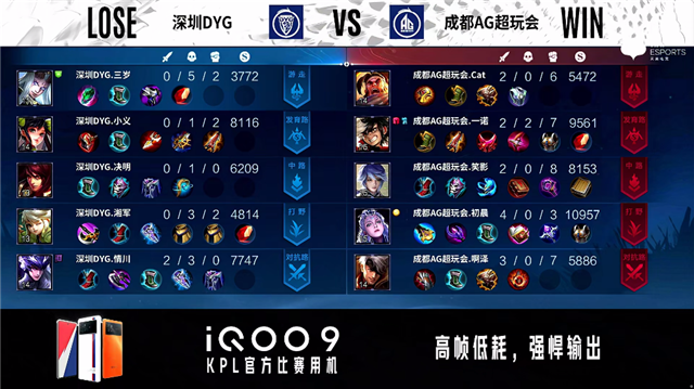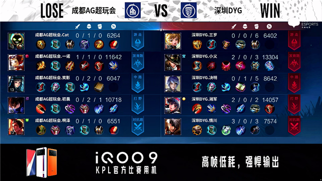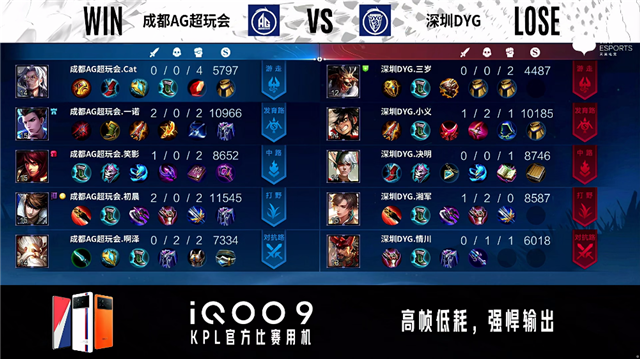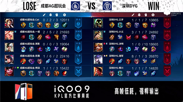 2分14秒,深圳DYG控下暴君。2分27秒,下路团,深圳DYG打出1换2。3分40秒,深圳DYG中路打出0换2。4分15秒,双方团战1换1。5分14秒,深圳DYG控下先知主宰。6分10秒,深圳DYG关羽下路单杀李元芳。8分08秒,野区团,成都AG超玩会击杀盾山。8分32秒,深圳DYG上路击杀蒙恬。9分11秒,深圳DYG击杀大乔。9分40秒,深圳DYG控下先知主宰,随后破掉成都AG超玩会上一塔。9分50秒,深圳DYG关羽下路再次单杀李元芳,随后队伍破掉成都AG超玩会中一塔并击杀蒙恬。11分17秒,深圳DYG控下暗影主宰。11分42秒,深圳DYG破掉成都AG超玩会中二塔。12分28秒,成都AG超玩会击杀盘古。12分56秒,成都AG超玩会控下暗影暴君。14分38秒,深圳DYG破掉成都AG超玩会下二塔。15分07秒,深圳DYG控下暗影主宰并击杀李元芳。15分50秒,深圳DYG破掉成都AG超玩会上二塔。16分16秒,成都AG超玩会中路击杀盾山。16分49秒,成都AG超玩会控下暗影暴君,随后破掉深圳DYG中一塔。17分50秒,深圳DYG击杀云缨。18分56秒,深圳DYG控下暗影主宰。20分25秒,双方团,深圳DYG打出0换4。20分51秒,深圳DYG破掉成都AG超玩会中高地。21分02秒,深圳DYG击杀不知火舞后破掉成都AG超玩会水晶赢下比赛。