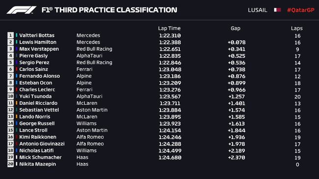 最终三练结束,博塔斯以1:22.310的成绩夺得三练头名;汉密尔顿第二,落后0.078秒;维斯塔潘落后0.341秒,排在第三;加斯利第四,佩雷兹第五;第六至第十位的车手分别是塞恩斯、阿隆索、奥康、勒克莱尔以及角田裕毅。