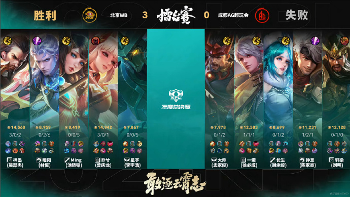 10分半,虽然成都AG抢下暗影暴君,但 北京WB梓墨 (吴喆杰)马超关键进场,配合队友带走对方三人,北京WB凭借团战优势,拿到暗影主宰。12分半,带着龙兵,北京WB先推下高,再破中高,随后高地持续拉扯,双方打出一换一。14分半,北京WB拉扯,先秒海月,随后逐个击破,一波破掉水晶,先拿赛点!