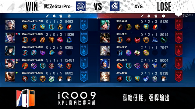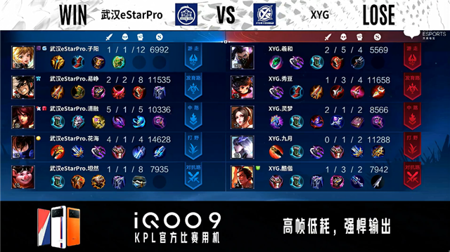 双方常规开局。3分50秒武汉eStar拿下主宰。8分整双方野区2换2。9分整XYG拿下主宰。9分29秒野区团战XYG打出0换2。9分44秒XYG拿下主宰。10分14秒XYG拿下暗影主宰。11分16秒武汉eStar中路击杀马可波罗并摧毁敌方发育路二塔。12分22秒武汉eStar摧毁敌方对抗路二塔。14分04秒野区团战武汉eStar打出0换3并拿下暗影主宰。14分43秒武汉eStar摧毁敌方水晶拿下比赛。