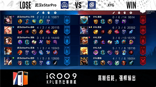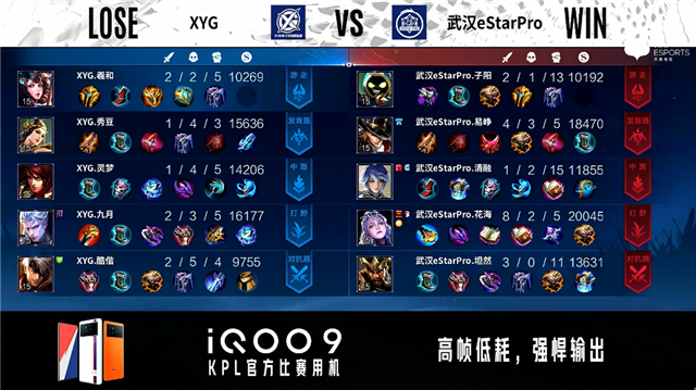 开局武汉eStar野区双入侵反掉红BUFF,52秒武汉eStar野区击杀鲁班大师拿到一血。3分08秒对抗路双方1换1。3分53秒武汉eStar拿下暴君。4分10秒野区团战双方1换1。5分46秒武汉eStar拿下主宰。5分56秒对抗路团战XYG击杀东皇太一,武汉eStar反掉蓝BUFF。6分30秒XYG摧毁敌方发育路外塔。7分15秒武汉eStar摧毁敌方发育路二塔。8分03秒武汉eStar摧毁敌方对抗路二塔。8分20秒武汉eStar中路击杀黄忠。8分51秒武汉eStar摧毁敌方中路外塔。9分整中路团战武汉eStar打出2换3。10分16秒武汉eStar拿下暗影主宰。11分29秒发育路团战双方1换1,武汉eStar摧毁敌方发育路高地塔。12分20秒武汉eStar拿下暗影暴君。13分23秒武汉eStar摧毁敌方中路高地塔。13分35秒武汉eStar摧毁敌方对抗路高地塔。14分03秒武汉eStar拿下暗影主宰。15分15秒高地团战XYG打出0换3。15分57秒XYG摧毁敌方中路外塔。16分06秒XYG拿下暗影暴君。17分54秒武汉eStar拿下暗影主宰。19分21秒高地团战XYG打出0换3。20分15秒XYG拿下风暴龙王。21分04秒XYG摧毁敌方中路二塔。21分14秒XYG摧毁敌方对抗路二塔。21分42秒XYG摧毁敌方对抗路高地塔。22分15秒野区团战双方2换2。24分25秒中路团战XYG击杀东皇太一。25分08秒中路团战XYG打出1换2。26分43秒XYG摧毁敌方发育路高地塔。27分50秒高地团战XYG击杀阿古朵。28分34秒XYG摧毁敌方水晶拿下比赛。