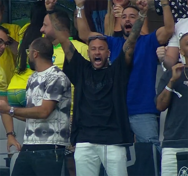 与第一场相同,内马尔来到场边观战,他依旧是大家关注的焦点,期间内马尔给巴西队加油助威,尤其是在帕奎塔第二次站上点球点,内马尔非常紧张,当帕奎塔主罚命中,内马尔也很激动,庆祝了起来。