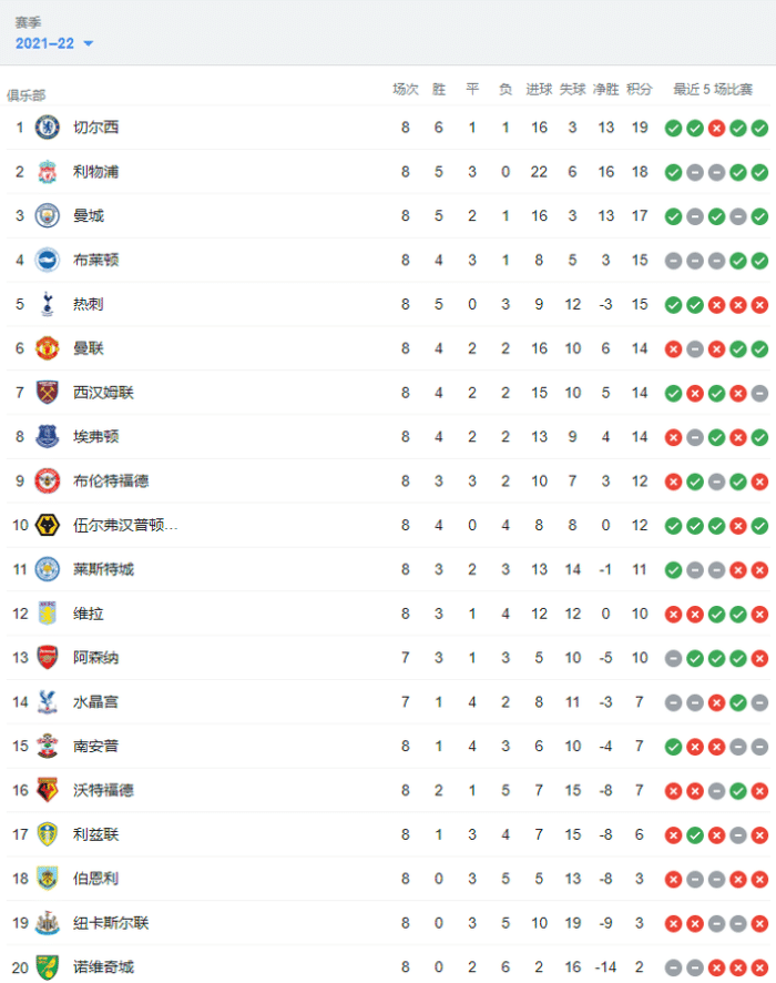 英超现在只剩下阿森纳和水晶宫还未进行第8轮比赛,目前切尔西8轮6胜1平1负,积19分排名第一,利物浦则积18分排名第二,曼城17分排名第三,布莱顿15分排名第四。