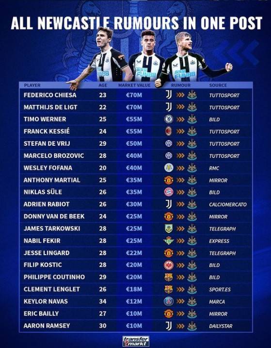 二、德转盘点纽卡20个潜在引援目标及其身价;