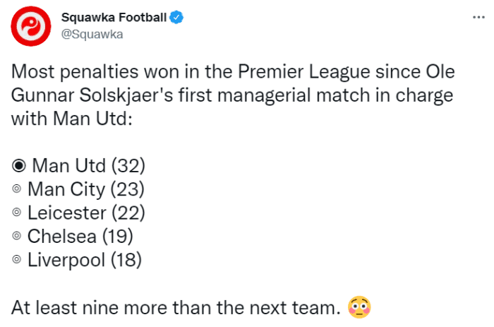 24直播网9月25日讯 据知名数据网站squawka统计,自从索尔斯克亚上任后,曼联已经在英超联赛获得32个点球,是所有英超球队中最多的。